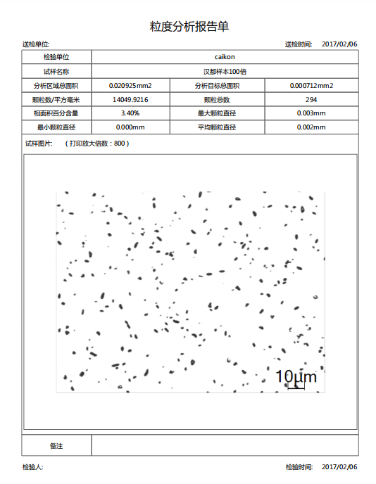可按用戶需求制作報告文檔的錄入界面、軟件可自動生成電子報告文檔,報告文檔內(nèi)容包括檢驗單位信息、分析結(jié)果、附有標(biāo)尺及設(shè)定的倍數(shù)照片、并提供報告的保存和打印功能。報告可保存成word、PDF、及EXCEL表格三種格式。用戶也可以調(diào)用已經(jīng)保存的報告文件。